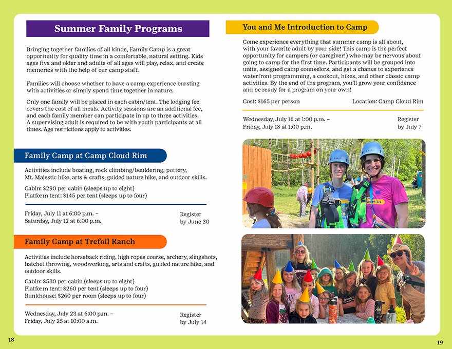 The camp catalog was designed on a high gloss 100 lb paper measuring 8.5 x 5.5 inches for a premium quality look a feel. These were mailed to over 7,000 families. Hundreds of catalogs were also printed and distributed by the council as recruitment materials.