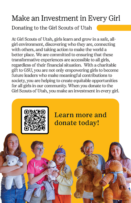 The Girl Scouts of Utah (GSU), empowers girls with experiences that inspire them to lead, explore, and make a lasting impact. Programs are designed around four key pillars—STEM, Outdoors, Entrepreneurship, and Life Skills—ensuring girls receive a well-rounded foundation that prepares them for the future.